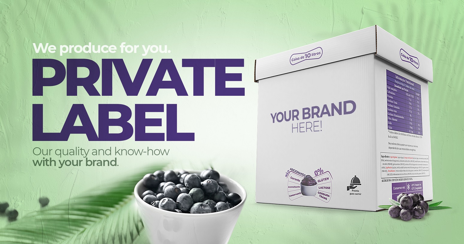 The Açai berry product with your brand. We manufacture for you You can take advantage to launch your own açai berry brand on the US market or improve an existent one with an incomparable quality of a premium product. We have more than 30 years of experience manufacturing, managing and selling with a competitive and odd know how. Optimize the capital and operational expenses focus your time on what really matters.
